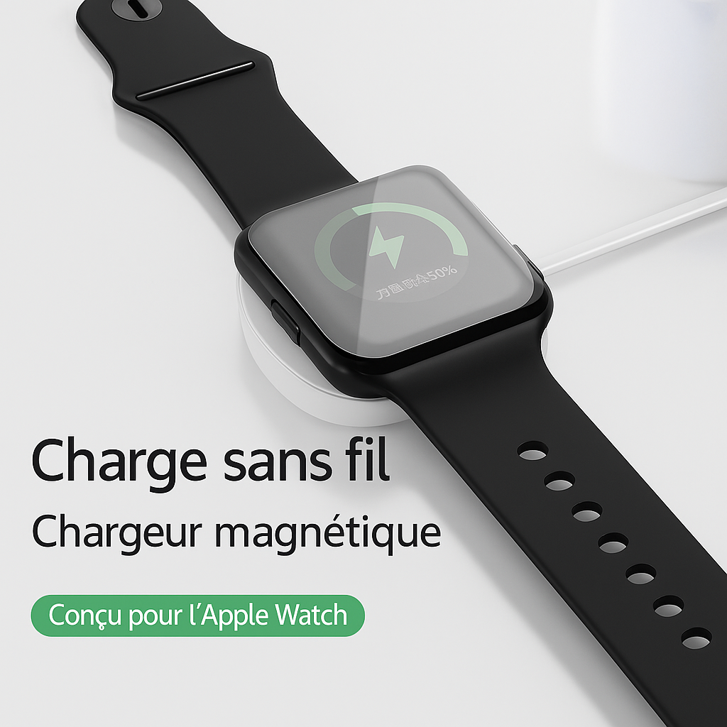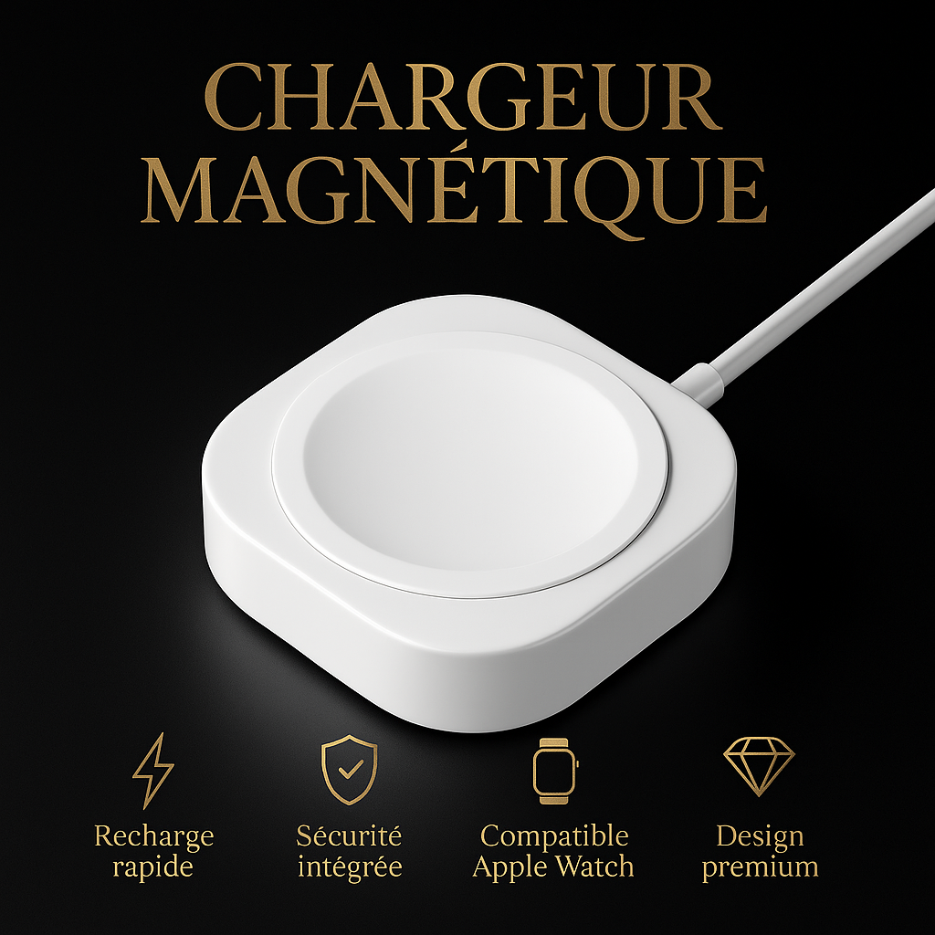 Offrez à votre Apple Watch la recharge qu’elle mérite avec le chargeur magnétique blanc Juste Connecté, conçu pour combiner design premium, vitesse de recharge et sécurité optimale. Compatible avec tous les modèles d’Apple Watch (Séries 1 à 10, Ultra, SE), ce chargeur est l’accessoire indispensable pour votre quotidien.