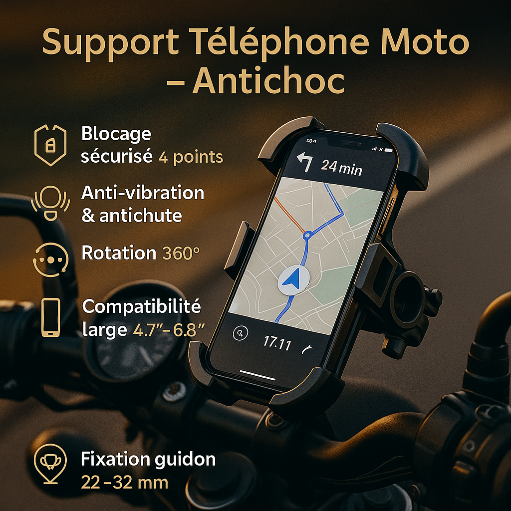 Facile à installer sur guidon (22 à 32 mm), ce support combine sécurité, design premium et praticité. Que tu sois en moto, en VTT ou en trottinette, il t’offre une expérience de conduite plus sûre et plus connectée.